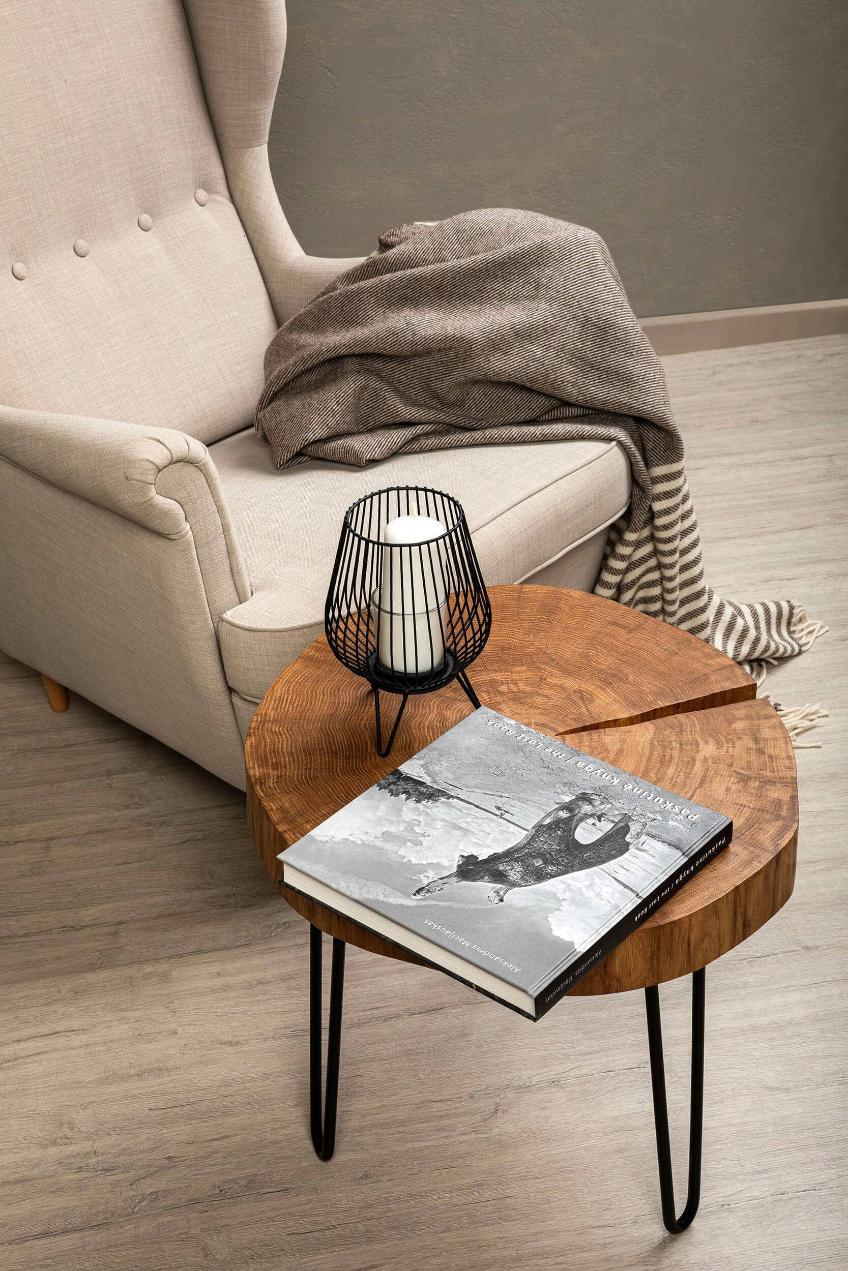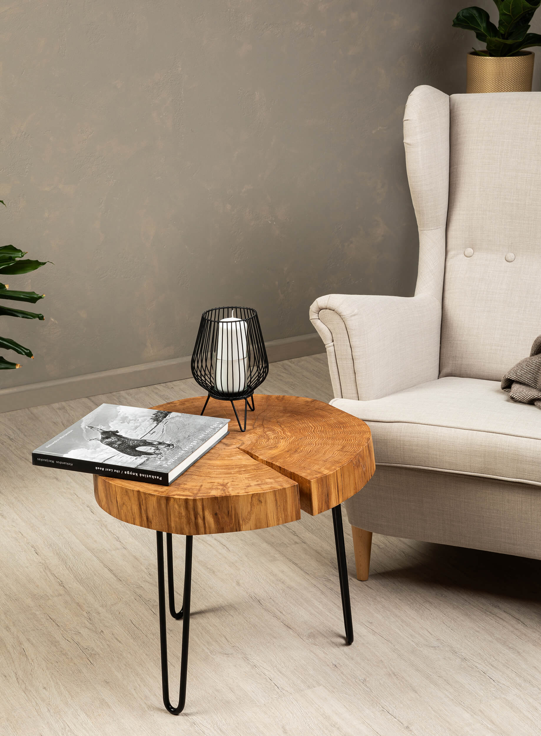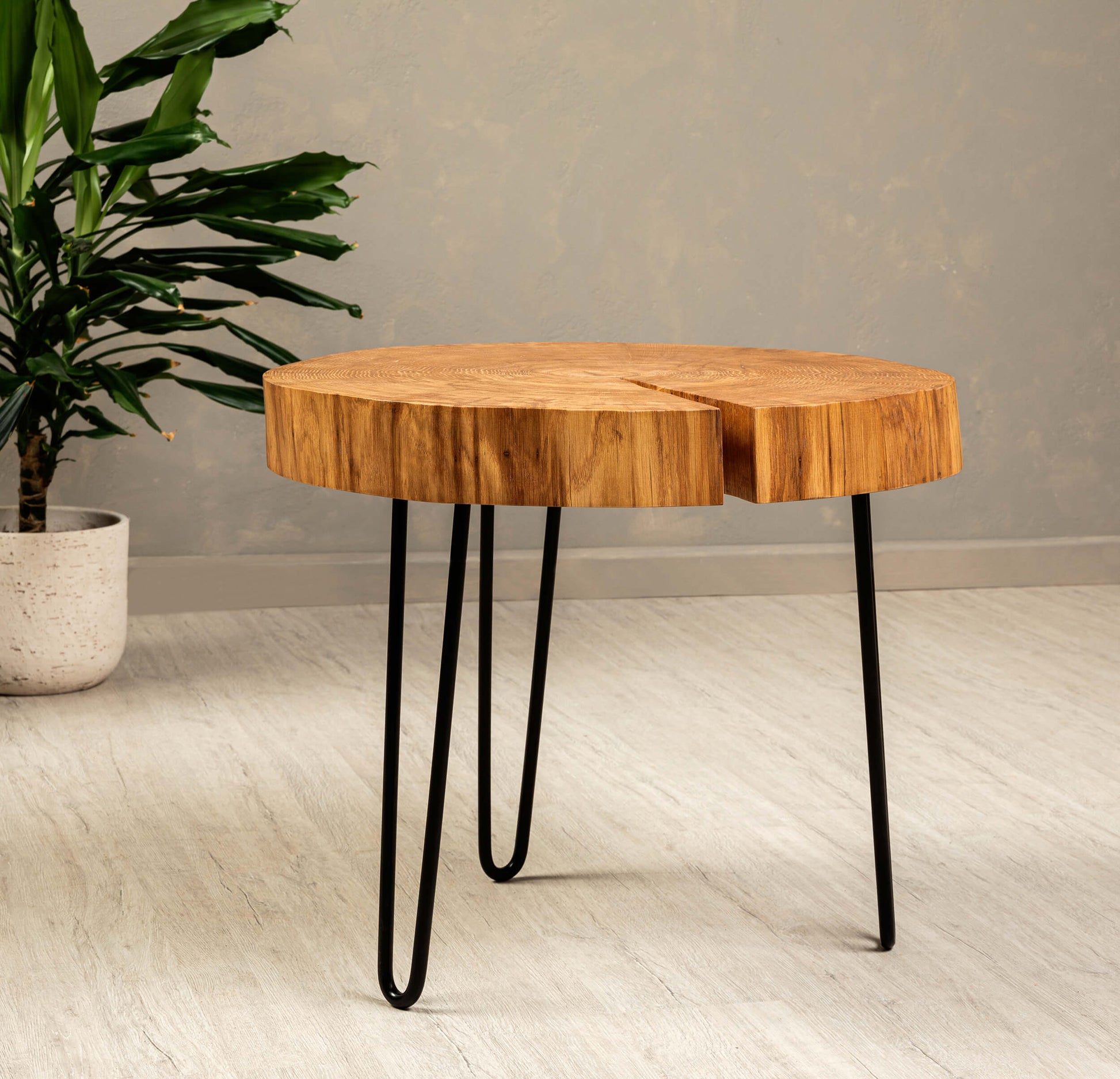 Tikra svetainės puošmena – APEIRO-60 apskritas kavos staliukas, pagamintas iš ąžuolo kamieno. Kiekvieno medžio raštas – unikalus, todėl tokį stalą turėsite tik jūs. Džiovinimo metu atsiskleidžia unikali ąžuolo medienos struktūra, kurią pagyvina prisotinimas natūraliu augaliniu aliejumi. Plieninės milteliniu būdu dažytos kojos suteikia stalui tvirtumo ir stabilumo.