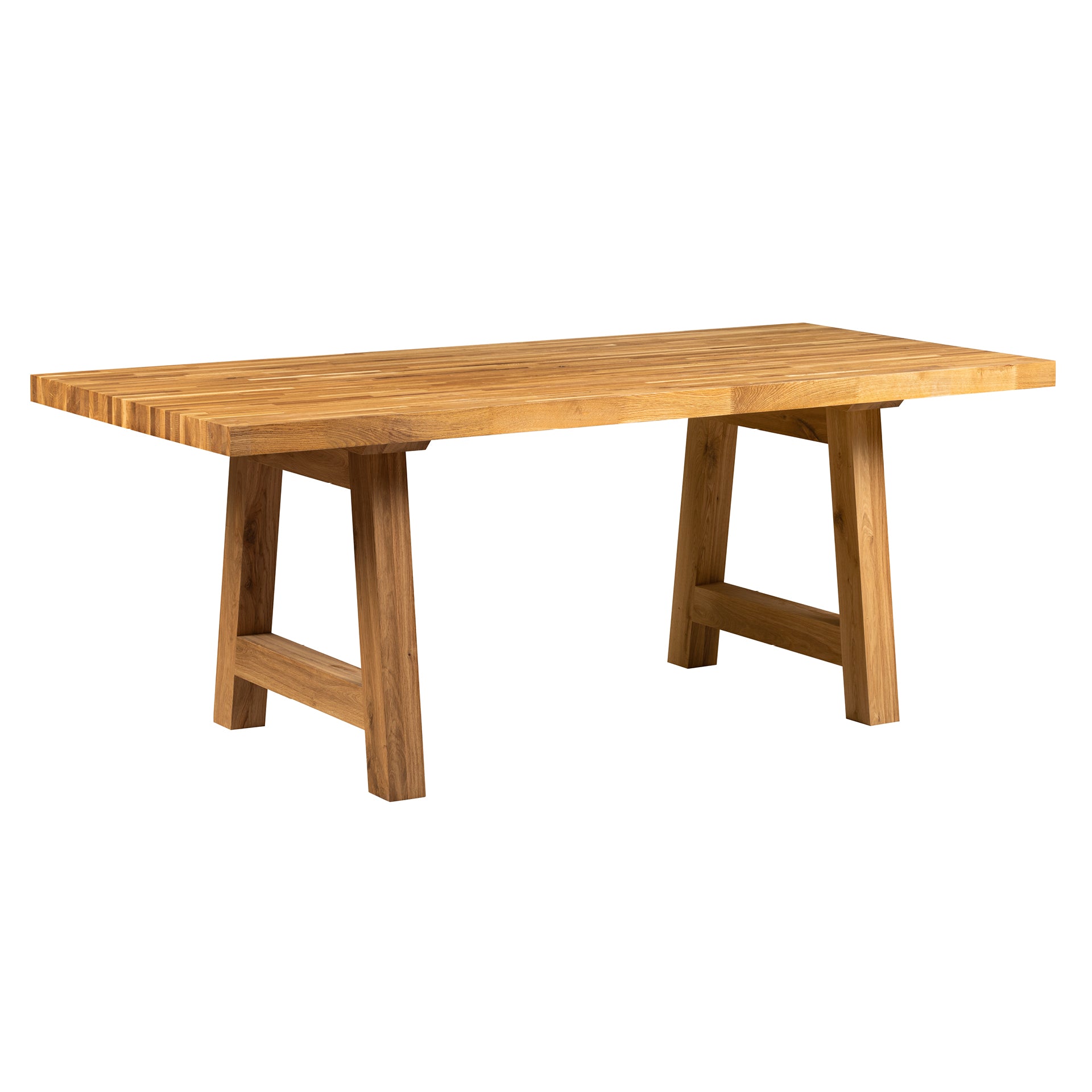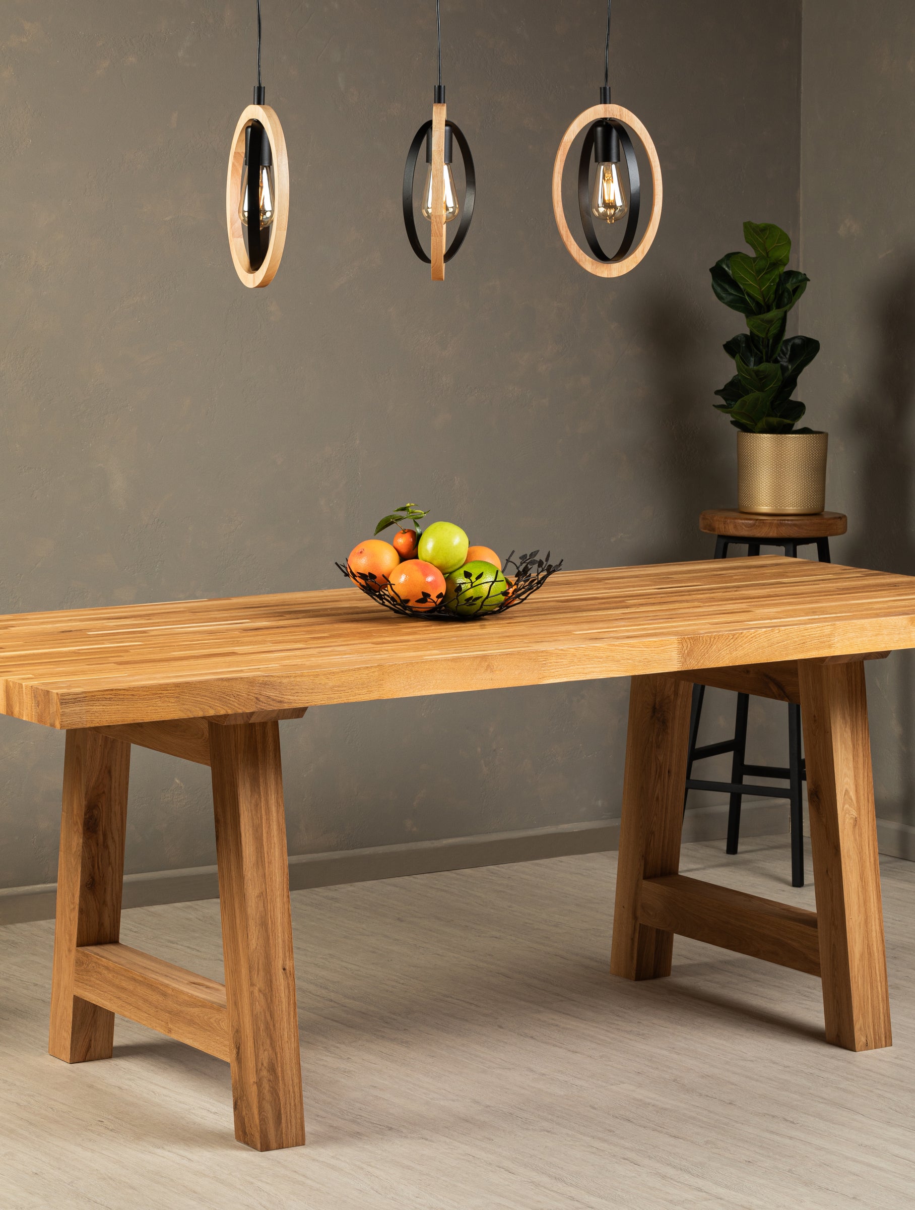 Iš žaismingų skirtingų atspalvių ąžuolinių lentelių suklijuotas LAMBADA stalviršis papuošia jūsų interjerą. Ypač tvirtos medinės A formos stalo kojos stilingai dera su ąžuoliniu stalviršiu ir sukuria vientisą stilių. Ilgaamžis ir patvarus – stalviršis gali būti atnaujinamas daugybę kartų. Dengtas natūraliu bespalviu aliejumi, siekiant išryškinti medienos grožį ir savitumą.